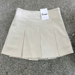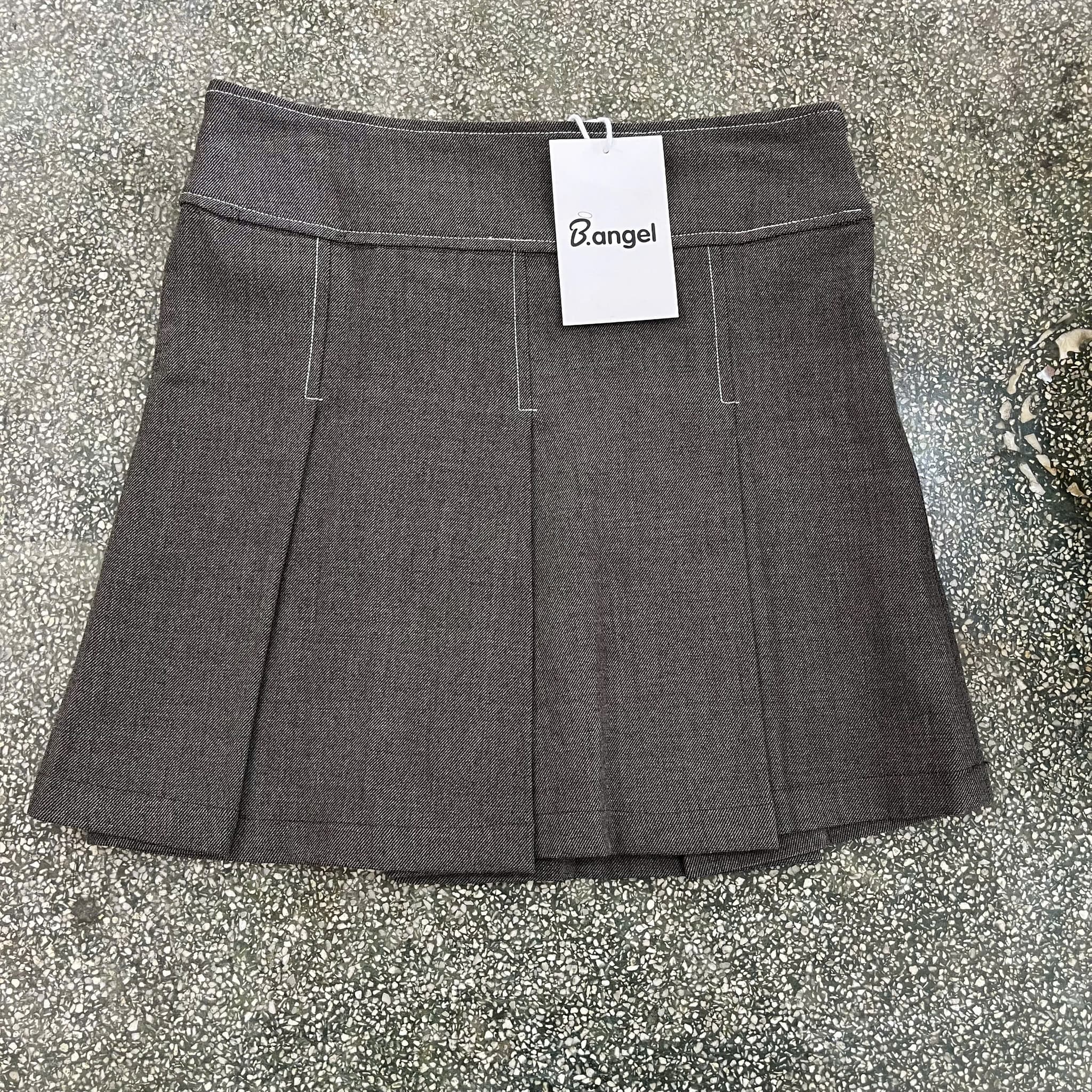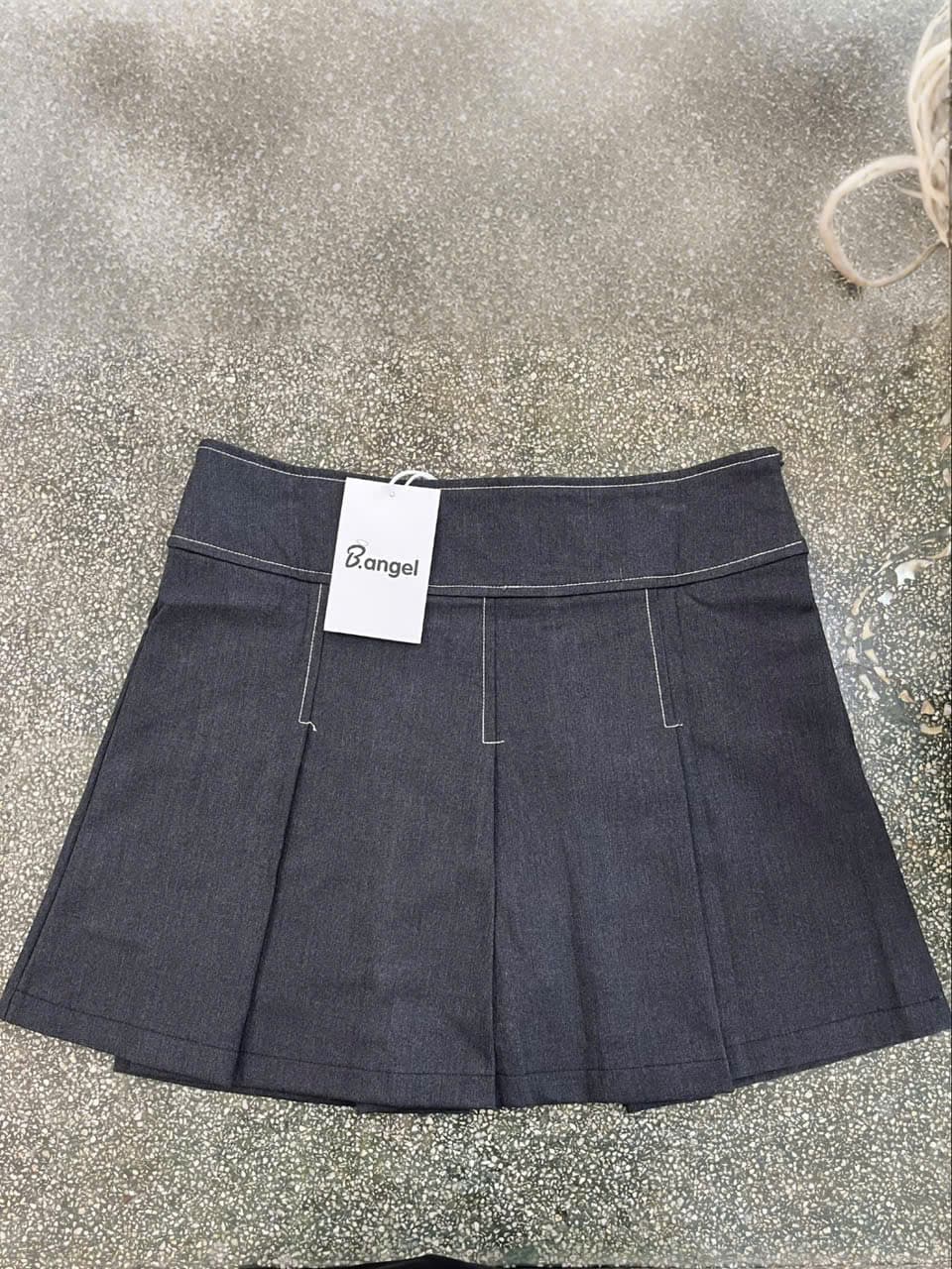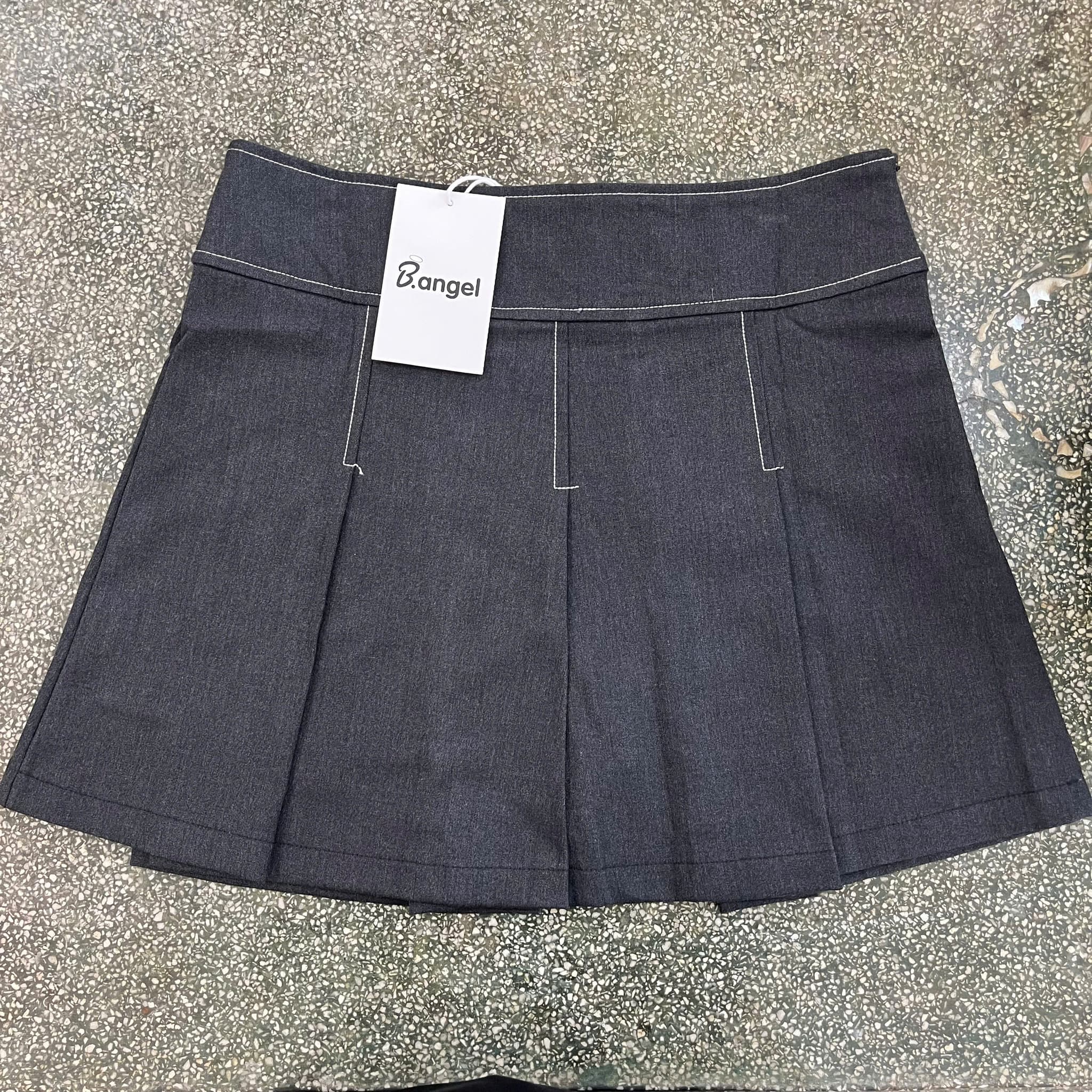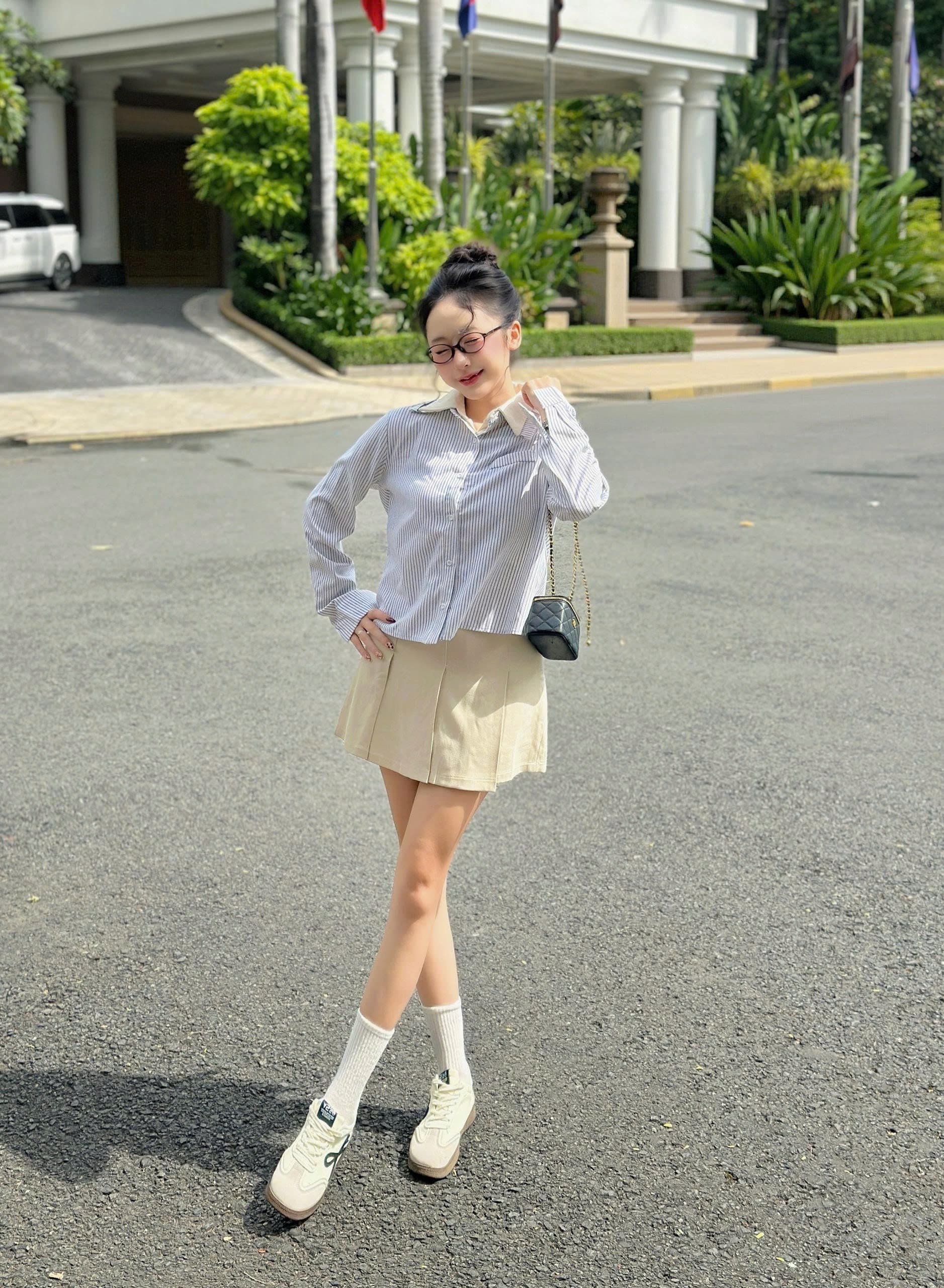 Chân váy quần dáng ngắn xếp ly, điểm nhấn là đường chỉ nổi tạo hiệu ứng thị giác và giúp váy thêm cá tính.